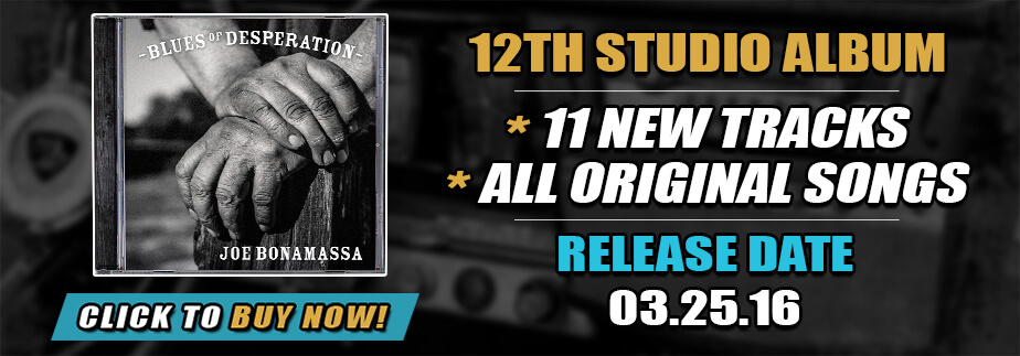 Blues of Desperation is Bonamassa's most powerfully diverse and boldly realized album yet, with the material ranging from the gutsy, gritty blues call to arms of "This Train" (Joe's guitar is set to "rude" throughout) to the elegant yet emotionally shattering ballad "What I've Known for a Very Long Time" to the soul-nourishing, acoustic-based Americana of "The Valley Runs Low," on which Bonamassa's voice rises up majestically to meet Barnes, McRae and Tippins in gospel-like rapture. And then there's the bleary, tequila-soaked "Drive," dripping with the kind of raw, wicked and unsettling sensuality that could make David Lynch green with envy.